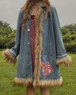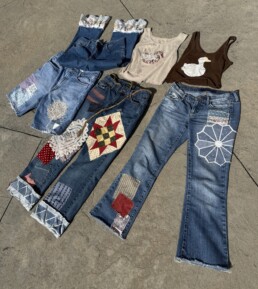 Alexis is a multidisciplinary artist working in secondhand clothing upcycling and fine arts painting. In her apparel work, she combines vintage fabrics and textile scraps to embellish preloved garments with a charming eccentricity. She is selling primarily patchwork jeans, along with cotton tanks and t-shirts adorned with various designs. She works with both hand-embroidery and a sewing machine.