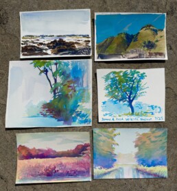 In her painting work, she utilizes the mediums of oil paint and watercolor and works primarily outdoors and on site, creating landscape pieces with an emphasis on the forces of life contained within them. She is fascinated by color and form, and the ways they may work together to instill reverence for the intricacies of the natural world. These paintings are available as original pieces and as prints. Also available are miniature watercolor field-paintings from various locations around the country.