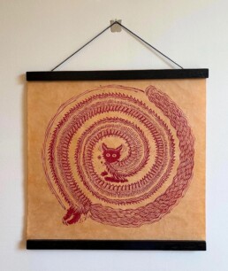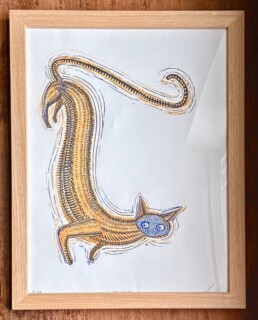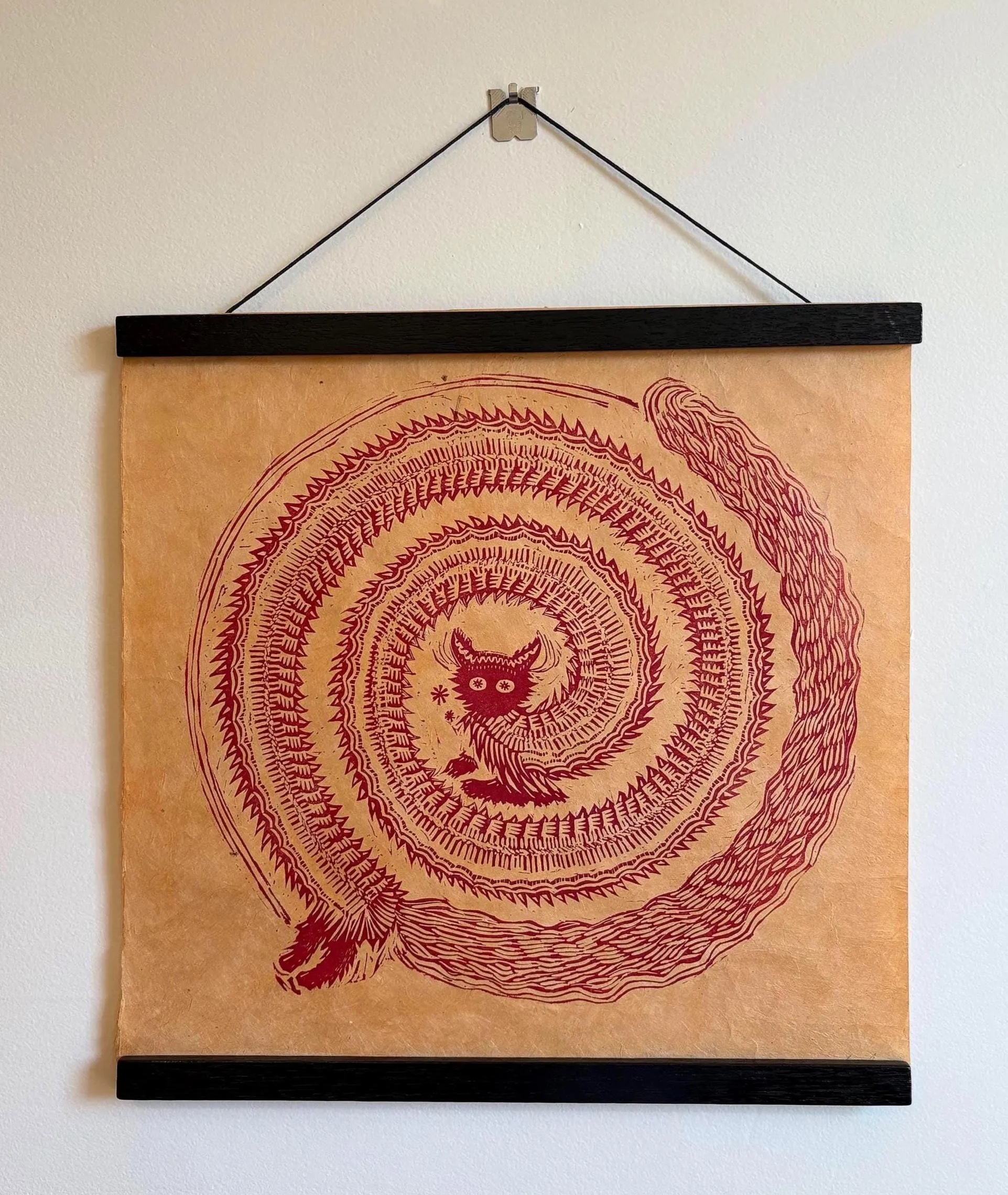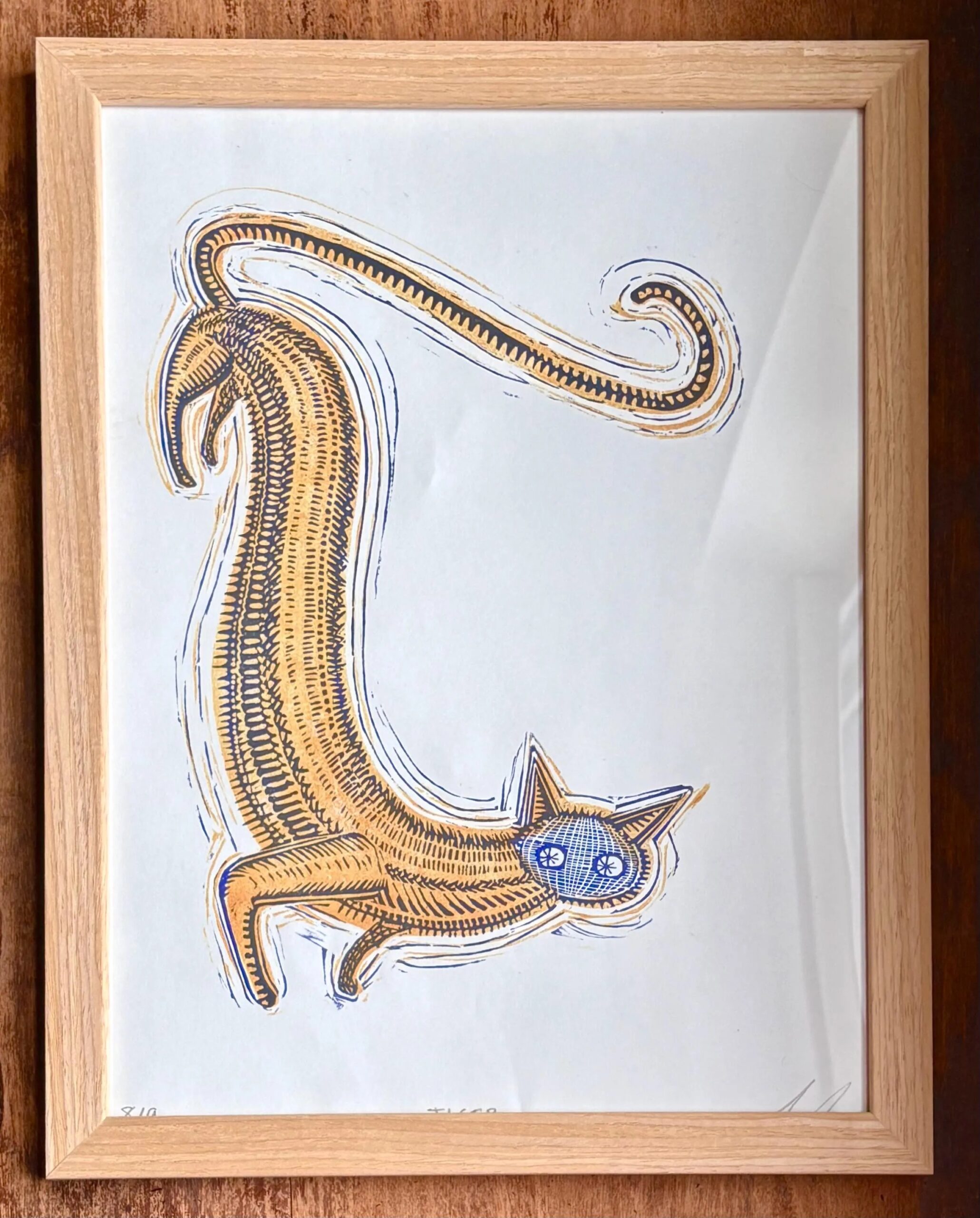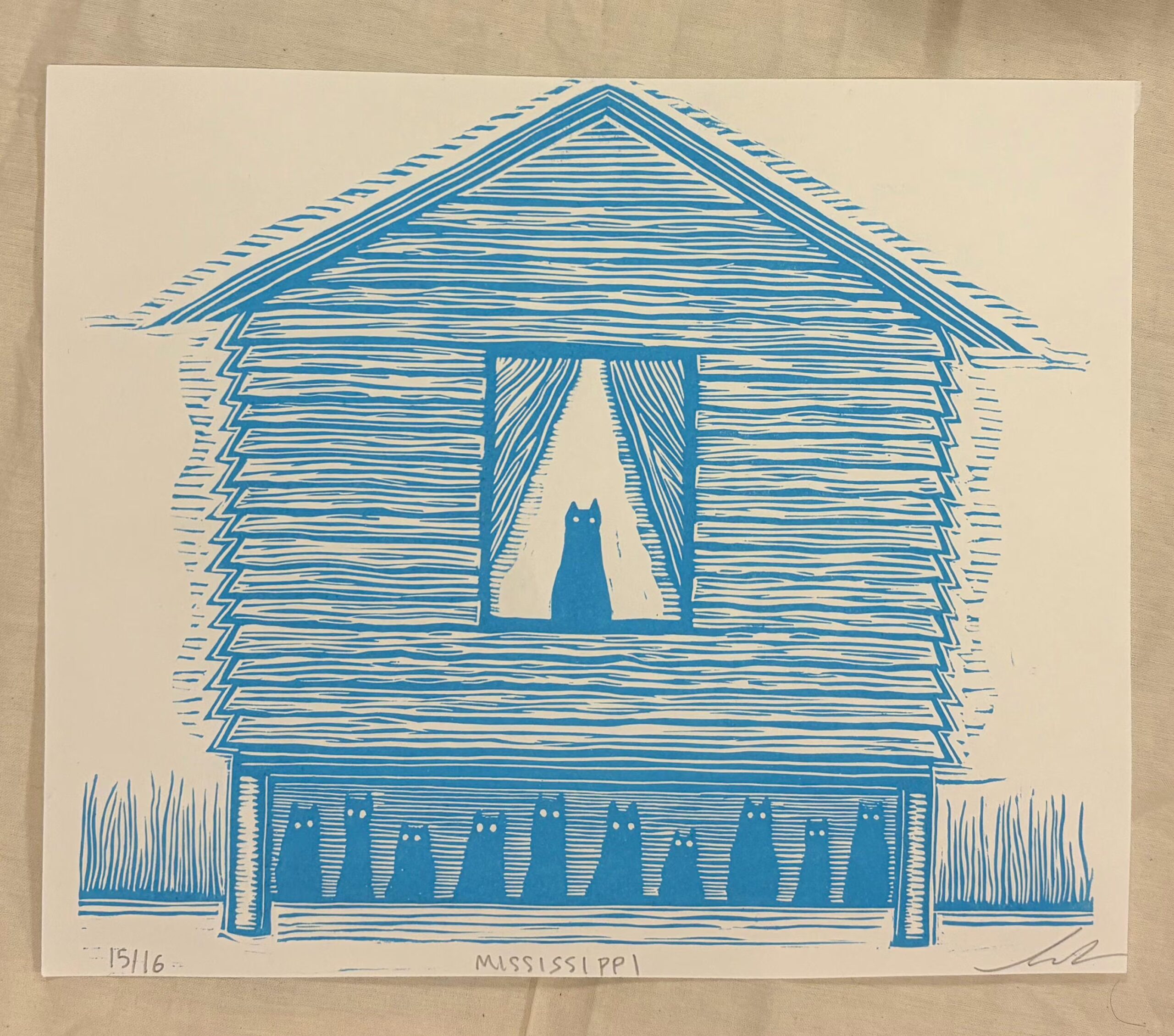 Cat Foot Prints is the printmaking studio of Sarah Goldman (BFA 23), specializing in original art printed from linoleum blocks that were illustrated, carved, and printed by hand. The images of the Cat Foot Prints world are meant to act as portals to realms of magic and mysticism, Americana and ancient folklore, the wonder and mysteries of nature, and powerful protective entities who take the form of a big long cat. While many scenes within have an element of whimsical darkness, each and every image has a touch of humor.