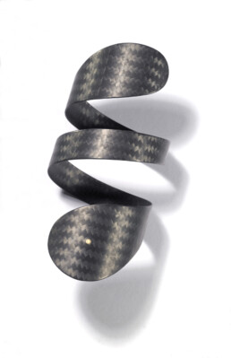 Drawing on inspiration from primitive design and modern aesthetic, I work to combine the strong, flexible, and intricate weave of carbon fiber with fine metals and precious stones. A strong and lightweight material unite with my linear, practical, and direct design. Carbon fiber, a material of the future, is paired with elements of a tribal past to create innovative, elegant (works) second-skin jewelry designed for swimming, surfing and casual dress up.