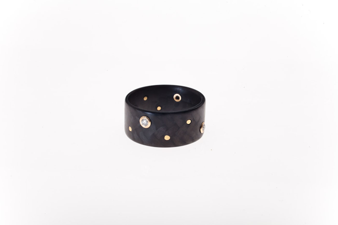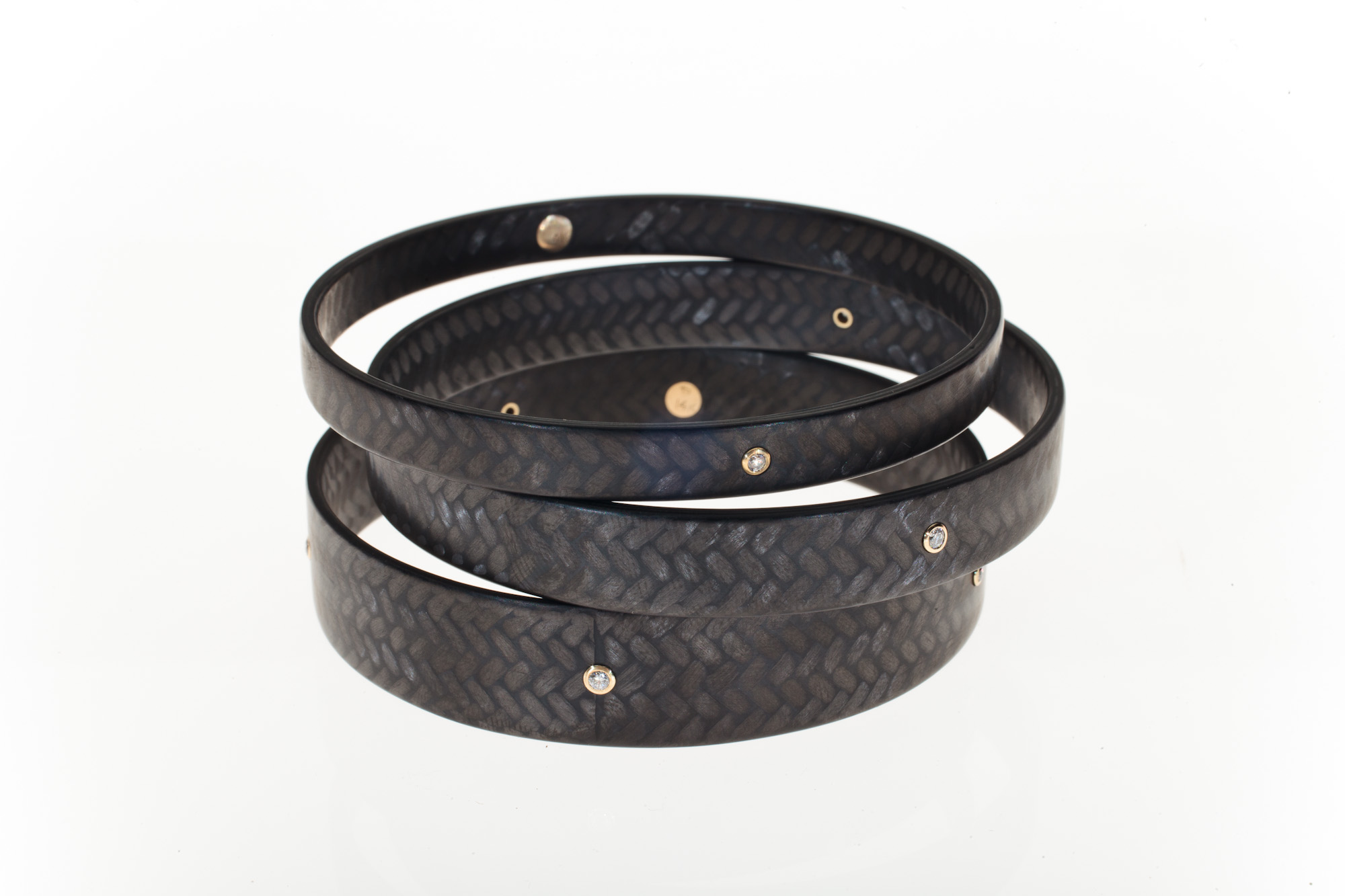 Drawing on inspiration from primitive design and modern aesthetic, I work to combine the strong, flexible, and intricate weave of carbon fiber with fine metals and precious stones. A strong and lightweight material unite with my linear, practical, and direct design. Carbon fiber, a material of the future, is paired with elements of a tribal past to create innovative, elegant (works) second-skin jewelry designed for swimming, surfing and casual dress up.