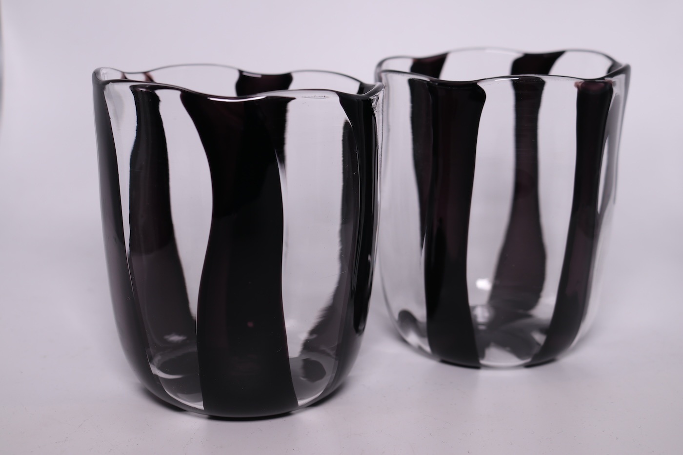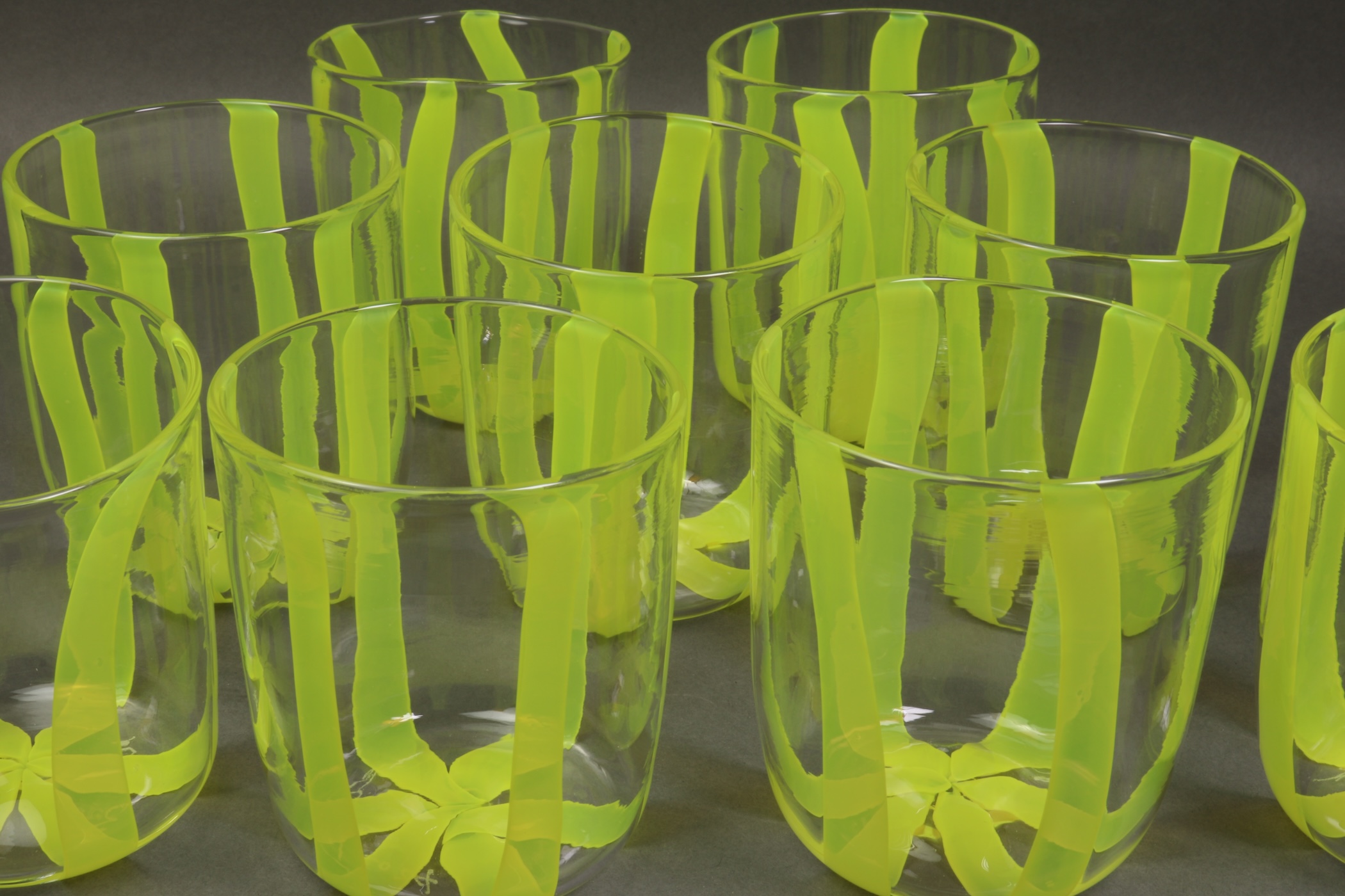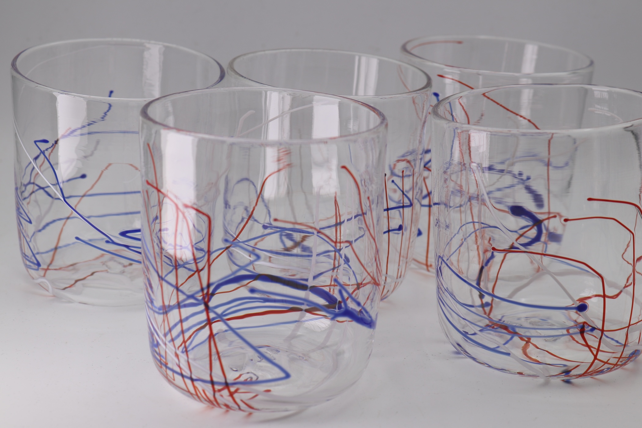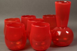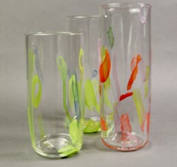 The work is handblown glass by Eva Goodman. Her work is process based and highlights the liquid qualities of glass. Transparency and opacity are constant qualities of this work that endlessly fascinate the artist/craftsman. Most of the work is functional and decorative. Eva feels that the basic objects in one’s home should provide pleasure.