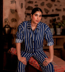 Rooted in sustainability, Harkoi Studio exclusively uses organic, rain-fed cotton, handloomed fabrics, and natural embellishments like handwoven patterns and wood block prints. Even the smallest details, from shell and brass buttons to corozo fastenings, reflect a commitment to eco-conscious choices.