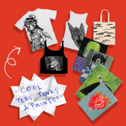Jessica (@bitterrish) sells handmade silkscreened tees and tank tops, along with prints of her illustrated works.