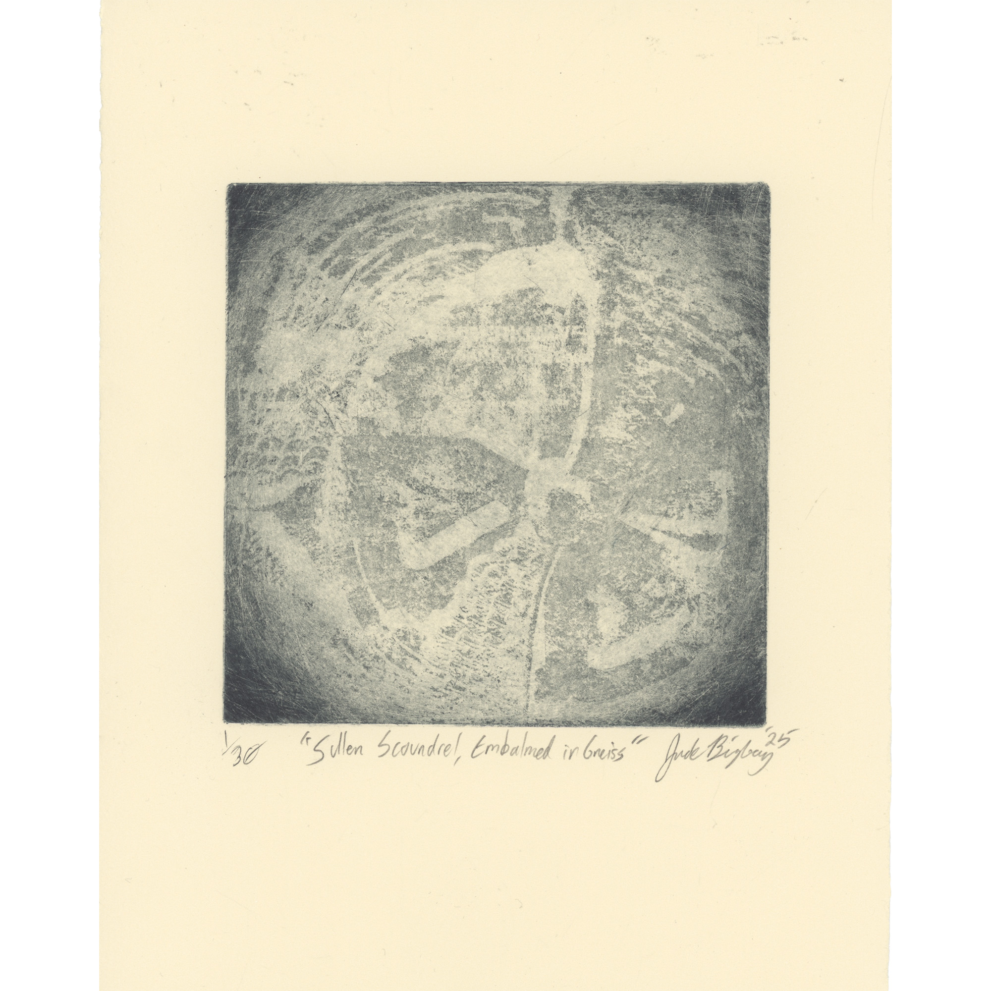 Jude’s intuitive and research-based practice serves as a way to process new ideas and feelings alongside the development of their imagery. Their work is invested in the printmaking process and how the vast array of print techniques can mimic or alter existing concepts in other fields of interest. Specifically, they are interested in technological, theological, and psychological concepts – and how they work in tandem or contradict each other.