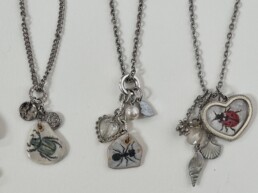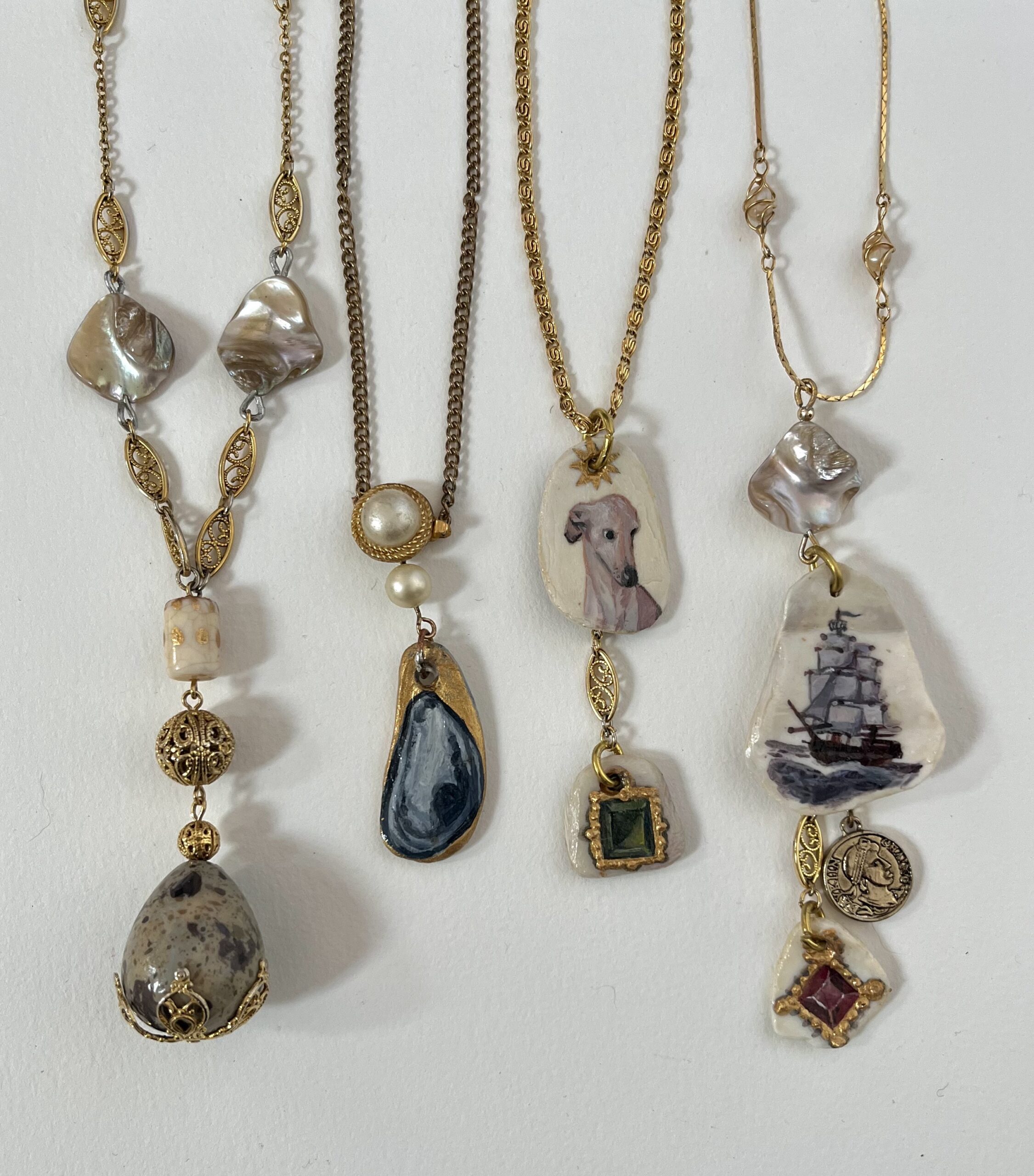 Kahlan Maguire works with materials found in the marshlands around her home, from snail shells to porcelain. Her miniature painted necklaces are finely detailed, free handed directly onto individually shaped clam shell fragments. Every component of her jewelry is reclaimed in some way, making every piece one-of-a-kind. Aside from her miniature paintings, she will be selling original framed paintings, decorative prints, and mystery jars.