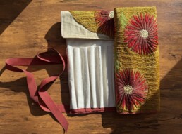 Available for sale: Clothing, accessories, artist tool rolls, fine art watercolor prints, and hand-dyed textiles.