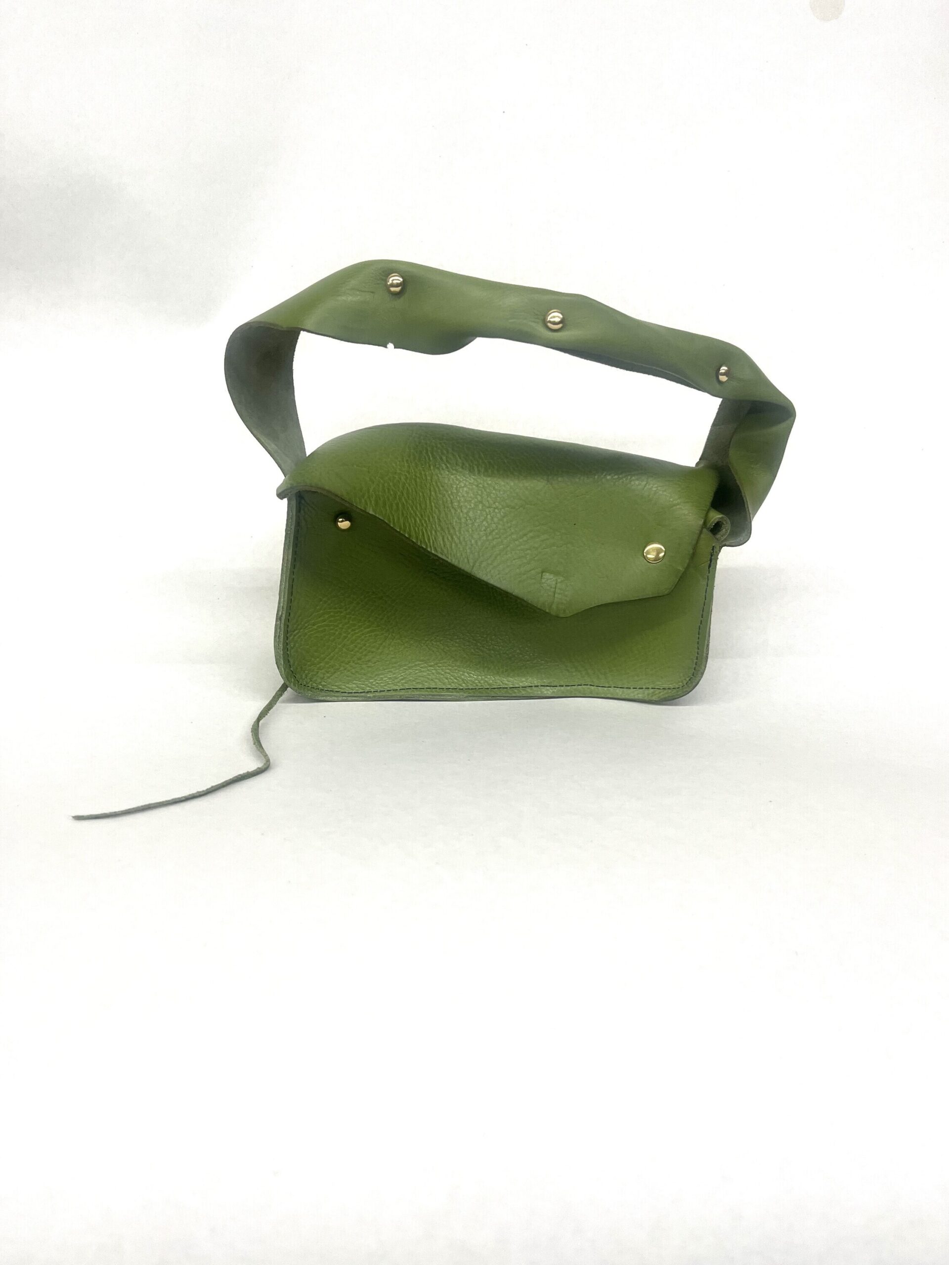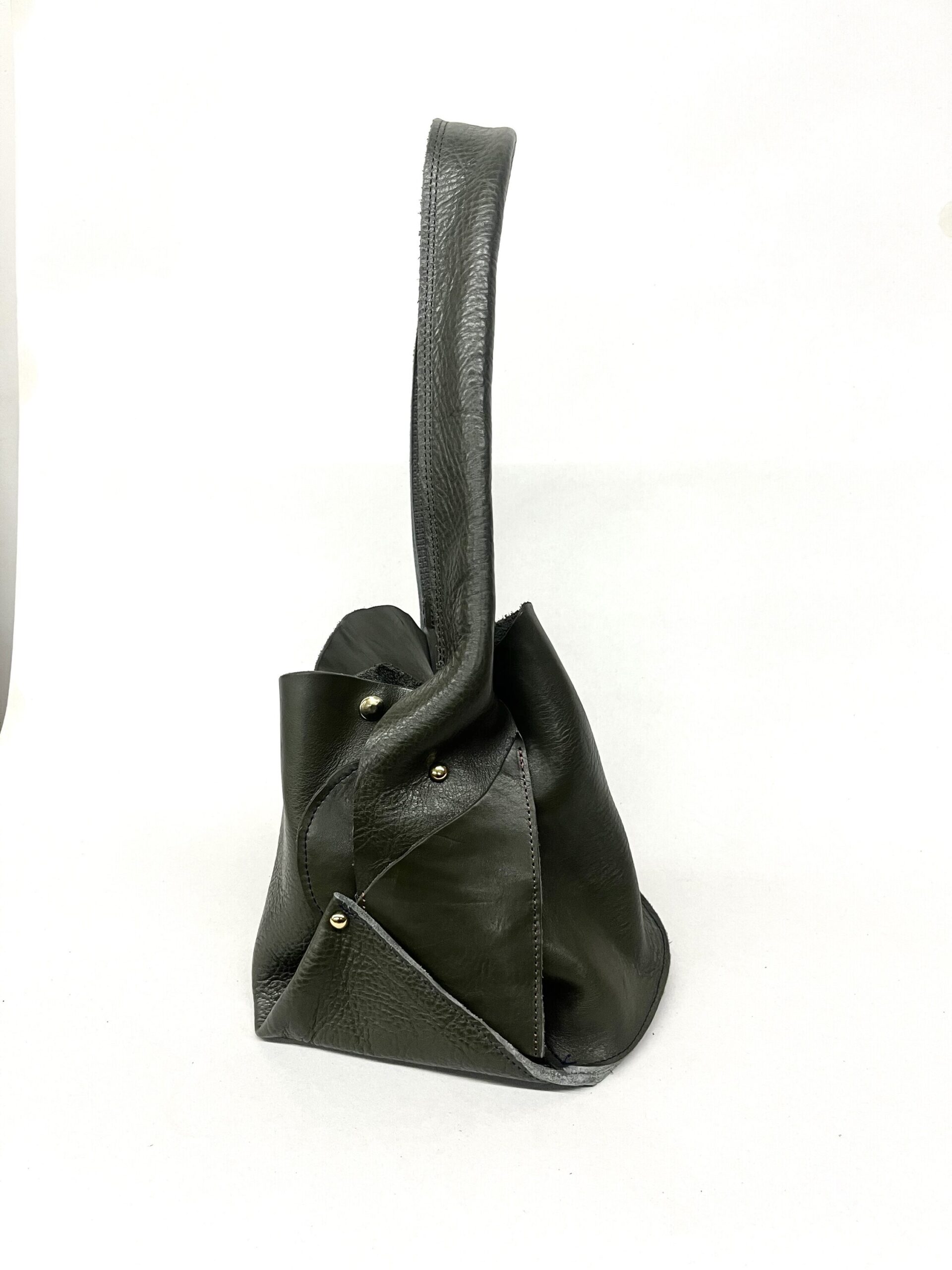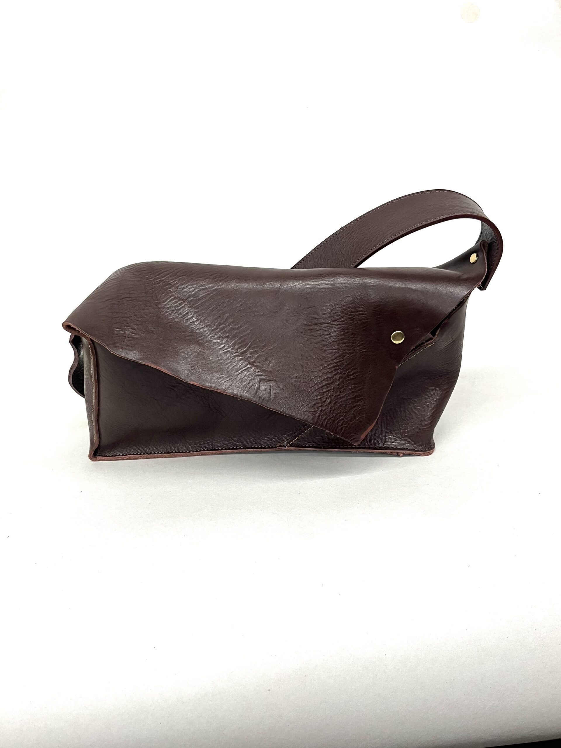 Lunchbreak Bags are one-off designs made from vegetable tanned cow hides. The leather used in the bags is scrap from a handbag factory in Providence RI, containing scars, tick bites, clamp marks from the stretching process, uneven pebble and other characteristics which deem a section of the hide unusable for commercial applications. The artist currently works as the cutter in the handbag factory but started out in assembly and has received free range to use other machines in the shop for personal projects during lunch break and after hours.