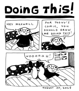 Maxwell Zawatsky is a cartoonist and educator based in Rhode Island. He is currently getting his MA in Art + Design Education from the Rhode Island School of Design in Providence, RI. His ongoing daily comic, The Blob Chronicles, details the everyday thoughts, actions, ideas, and general occurrences of himself, his wife, Raine, and everyone/thing around him. When he’s not sitting at his desk drawing, he can be found running, visiting local coffeeshops/cafes and bookstores, and watching cartoons. His work can be found at Patreon.com/maxwelltheblobman, maxwellzawatsky.com, and @maxwelltheblobman on Instagram.