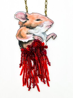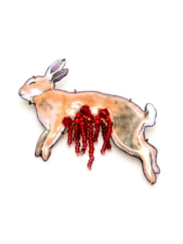 It’s the strange juxtapositions often present in death —blood shimmering like gems in the sunshine, and peaceful faces at odds with mangled bodies— that not only inspire her but also influence her materials. Working from her personal photo library of animals she’s come across over the years, she paints them using watercolor enamels which enable her to lend a delicateness to the dark imagery and continue enamel’s history of being used in particularly sentimental pieces of jewelry, making it the perfect medium to honor the often discarded lives of the animals she depicts.