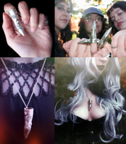 Muffy is also bringing a selection of new hand printed apparel for babies, kids, and adults in bold patterns and a range of palettes. And she’ll have plenty of cast metal witch finger necklaces and key chains for people who love a little spooky flair all year long.
