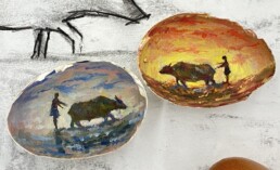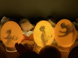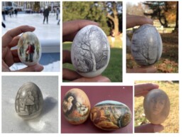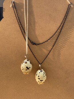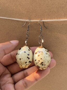 Musricul Anwar creates delicate handmade jewelry and miniature artworks using emptied quail and chicken eggshells. Each shell is carefully treated to enhance its strength while preserving its natural fragility. His work features intricate paintings and organic adornments like coriander seeds, reflecting themes of sustainability, transformation, and the beauty found in impermanence.