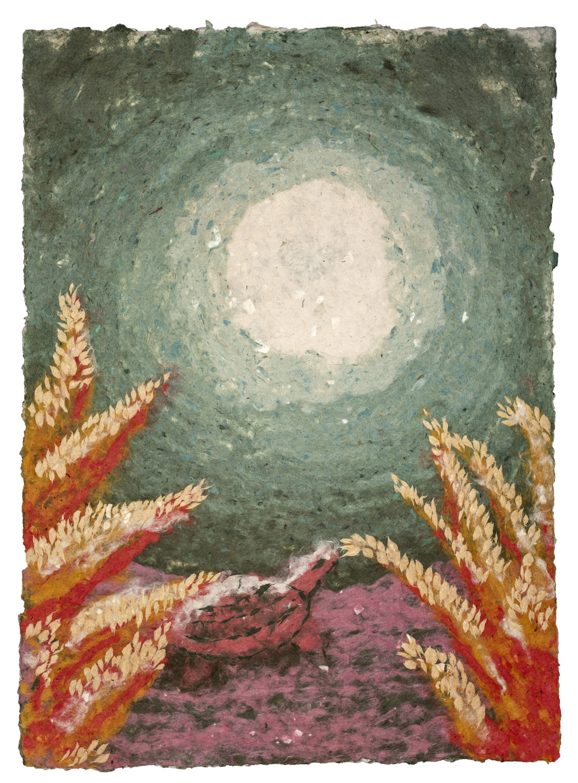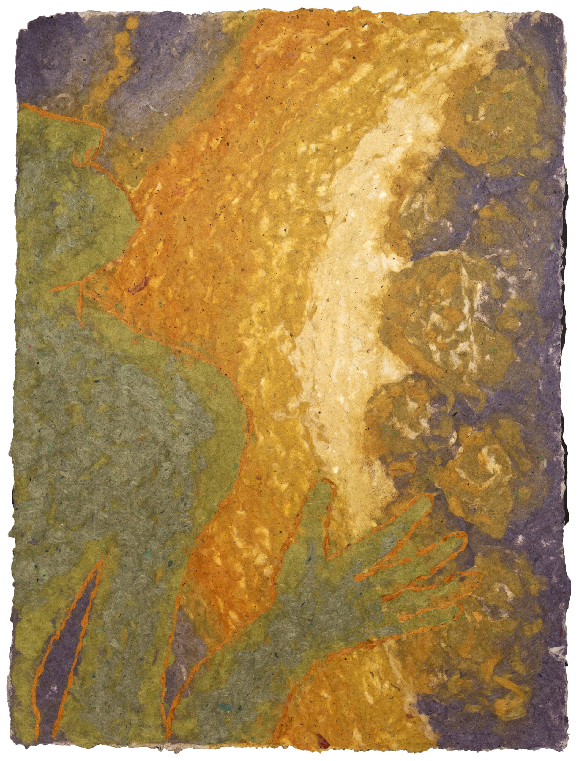 The work is created through a combination of papermaking, printmaking, and drawing. Recycled fibers and materials play a central role, reflecting a commitment to reuse as an active process of transformation. Through this approach, materials carry forward their previous histories while taking on new purpose and meaning.