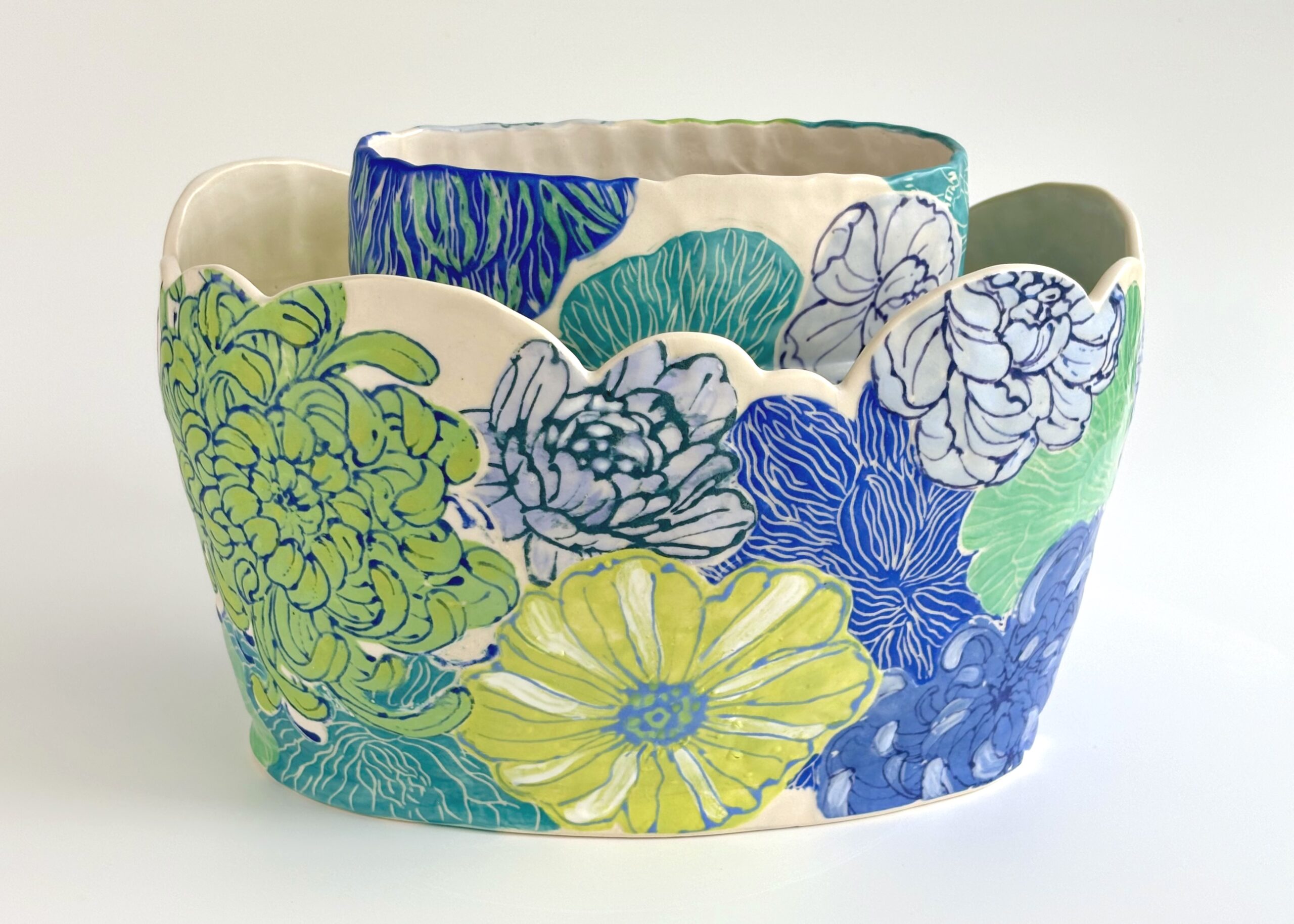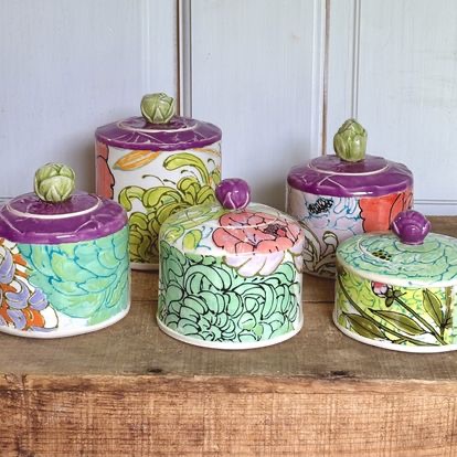 Drawing on her love of natural forms, Christine uses her illustrative skills to hand paint transfers for her red and white stoneware mugs, vases, plates and other functional ware and porcelain jewelry.
