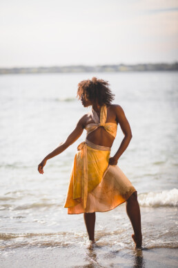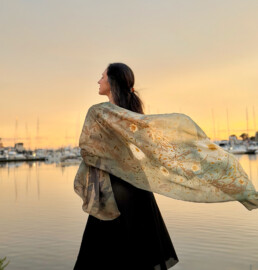 Sashoonya is a textile art and design company that creates sustainable textile products using local materials and dyes derived from our natural surroundings in New England. Working with natural dyeing and eco-printing techniques, Sasha Azbel, the director of Sashoonya, crafts silk scarves, wall hangings, clothing, and home goods. She never employs toxic chemicals in her art. She dyes her textiles with home-grown plant extracts, and carefully foraged macro-algae, (seaweed). Sasha never uses pesticides, herbicides, or synthetic fertilizer on her plants, only compost.