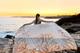 Her textile goods, infused with the colors and the essence of the landscapes we cherish, are talismans and symbols of a world that prospers through care and connectivity. Her belief is that our identities are interlinked with our natural world, and that textiles are an important mechanism for communicating and nurturing this connection.