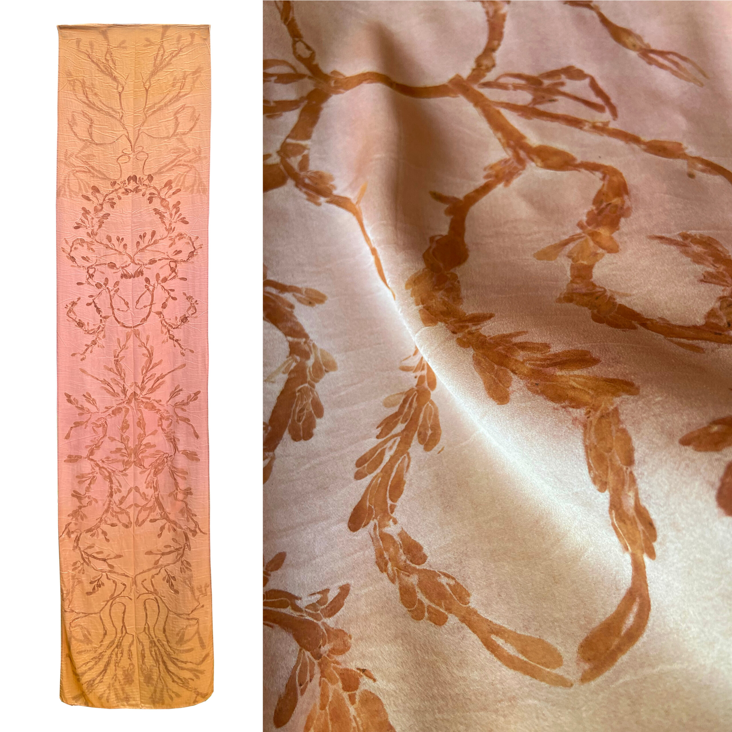 Sashoonya is a textile art and design company that creates sustainable textile products using local materials and dyes derived from our natural surroundings in New England. Working with natural dyeing and eco-printing techniques, Sasha Azbel, the director of Sashoonya, crafts silk scarves, wall hangings, clothing, and home goods. She never employs toxic chemicals in her art. She dyes her textiles with home-grown plant extracts, and carefully foraged macro-algae, (seaweed). Sasha never uses pesticides, herbicides, or synthetic fertilizer on her plants, only compost.