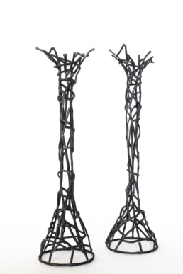 Marsha Sue Trattner makes hand-forged steel home objects, focusing on tableware and cookware, as well as lighting, garden structures, and architectural metal work. Some of the work, as in the lamps, are made of an accumulation of forged rod lines or shapes. Each work, even in series, is made one at a time, and is therefore unique.