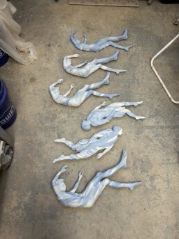 Sophie Gibson presents a series of soda-fired porcelain wall sculptures depicting figures in buoyant, gravity-defying poses. Sculpted in relief, these foreshortened bodies dance across the wall and evoke a skyscape. This body of work was inspired by Gaston Bachelard’s text, “Air and Dreams: An Essay on the Imagination of Movement.”