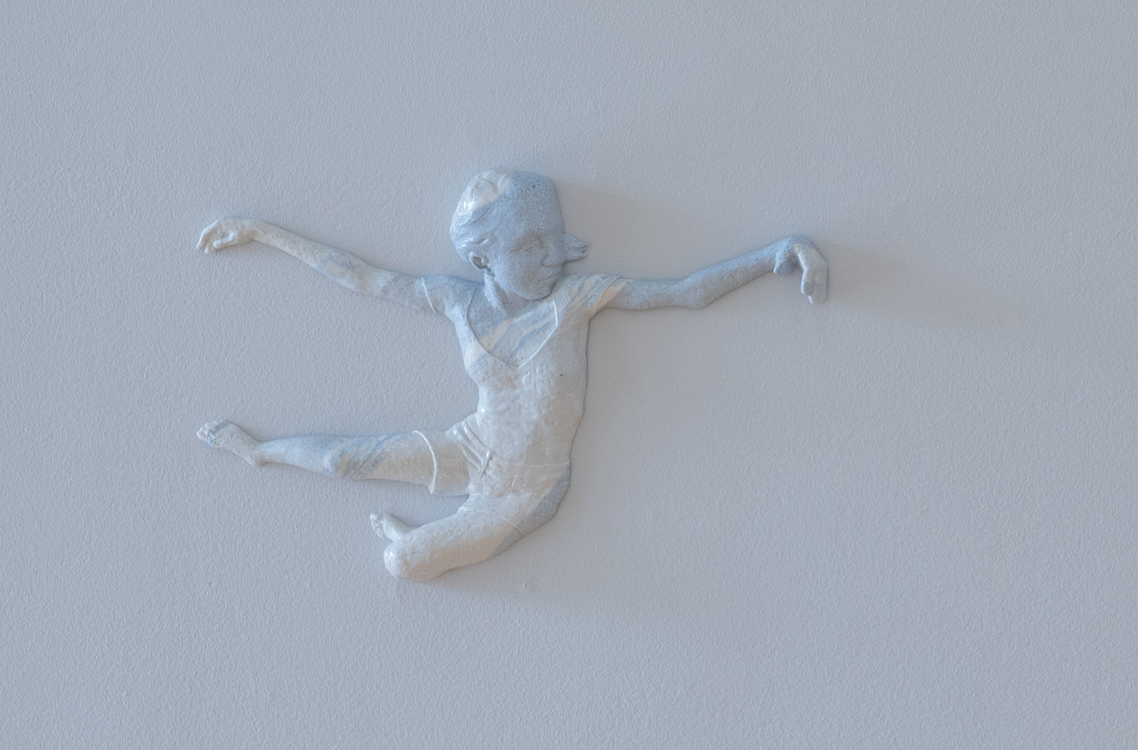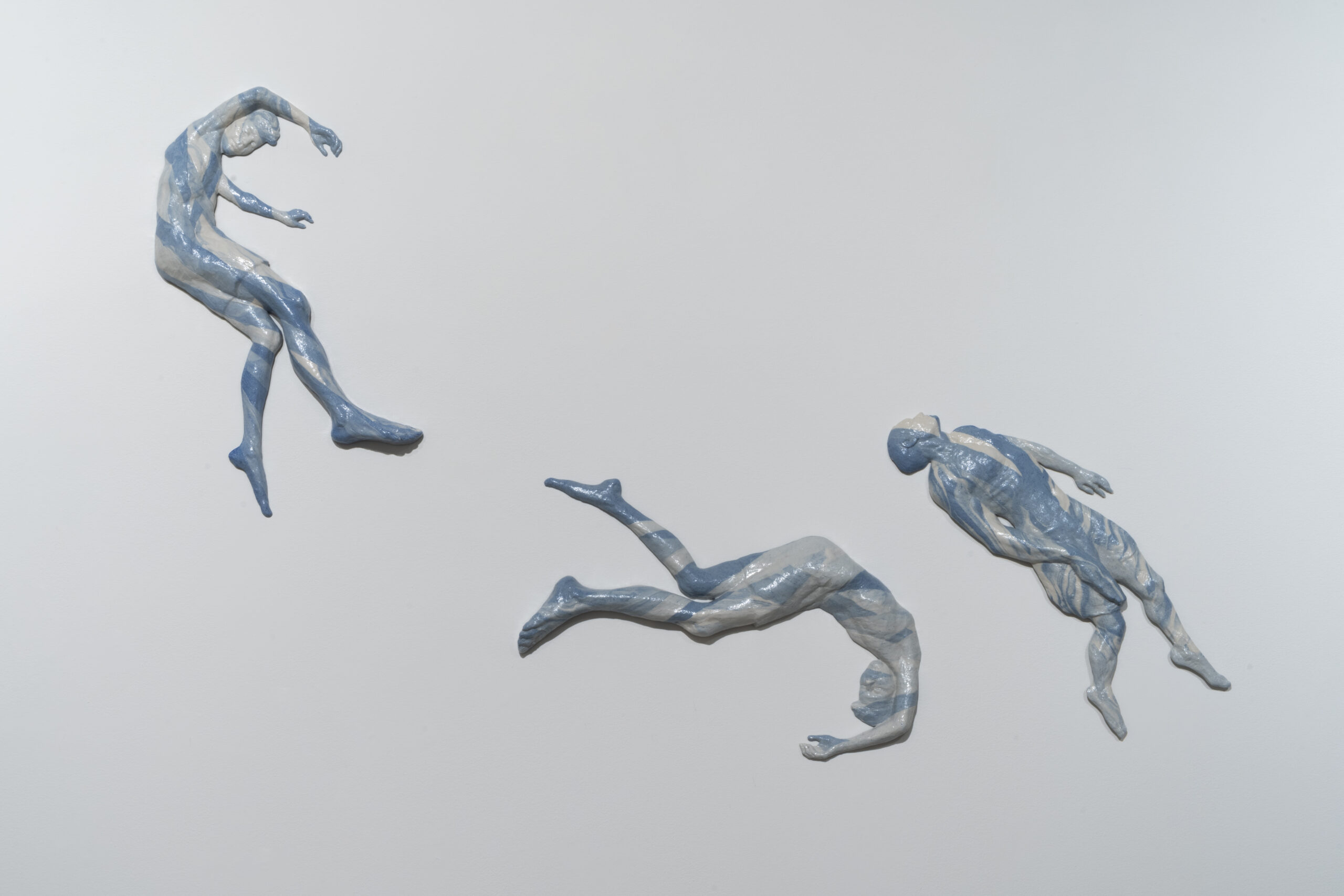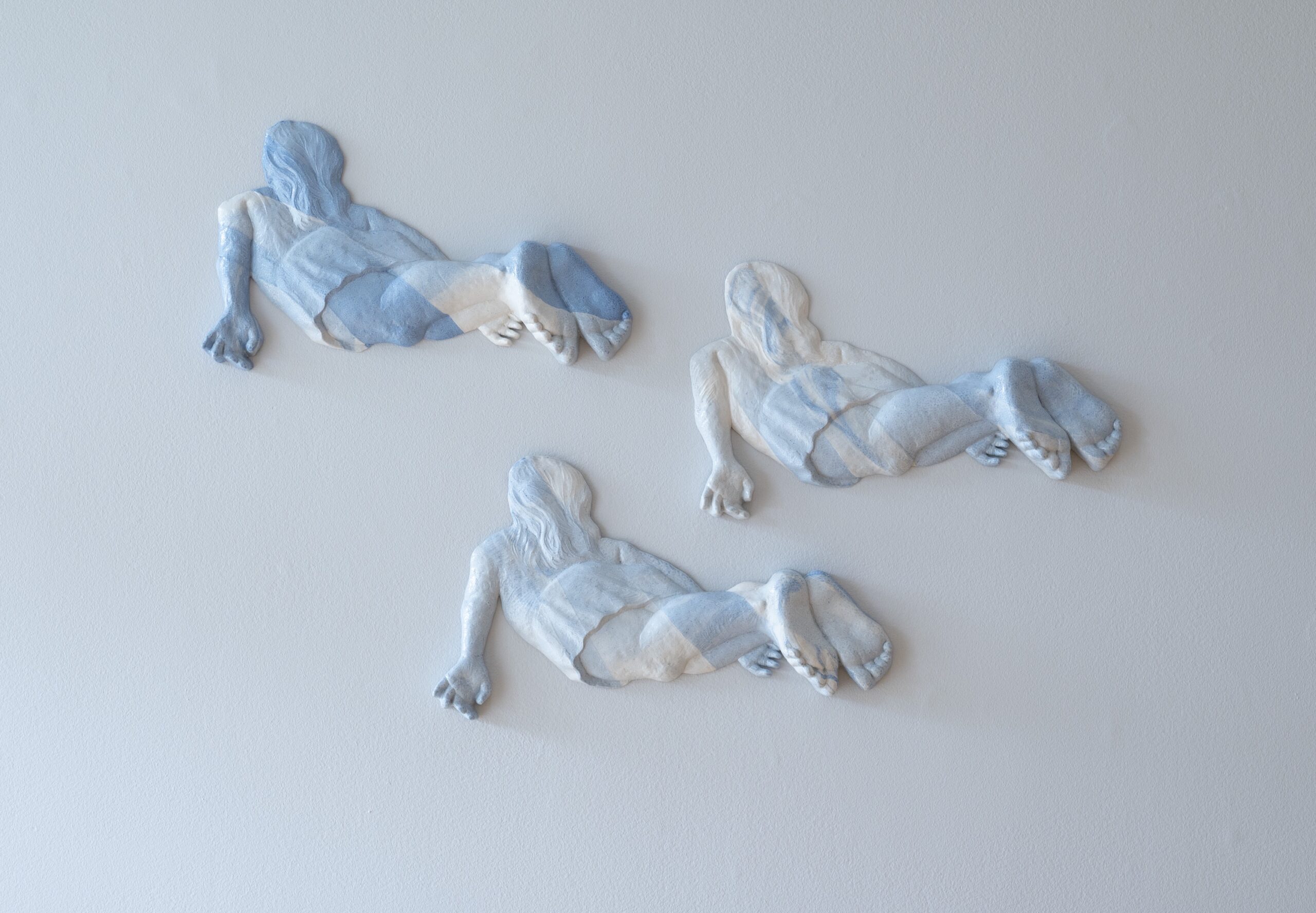 Sophie Gibson presents a series of soda-fired porcelain wall sculptures depicting figures in buoyant, gravity-defying poses. Sculpted in relief, these foreshortened bodies dance across the wall and evoke a skyscape. This body of work was inspired by Gaston Bachelard’s text, “Air and Dreams: An Essay on the Imagination of Movement.”