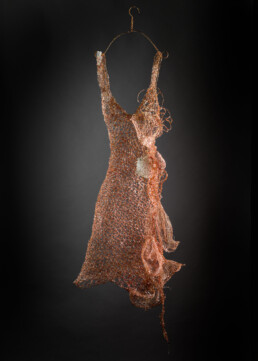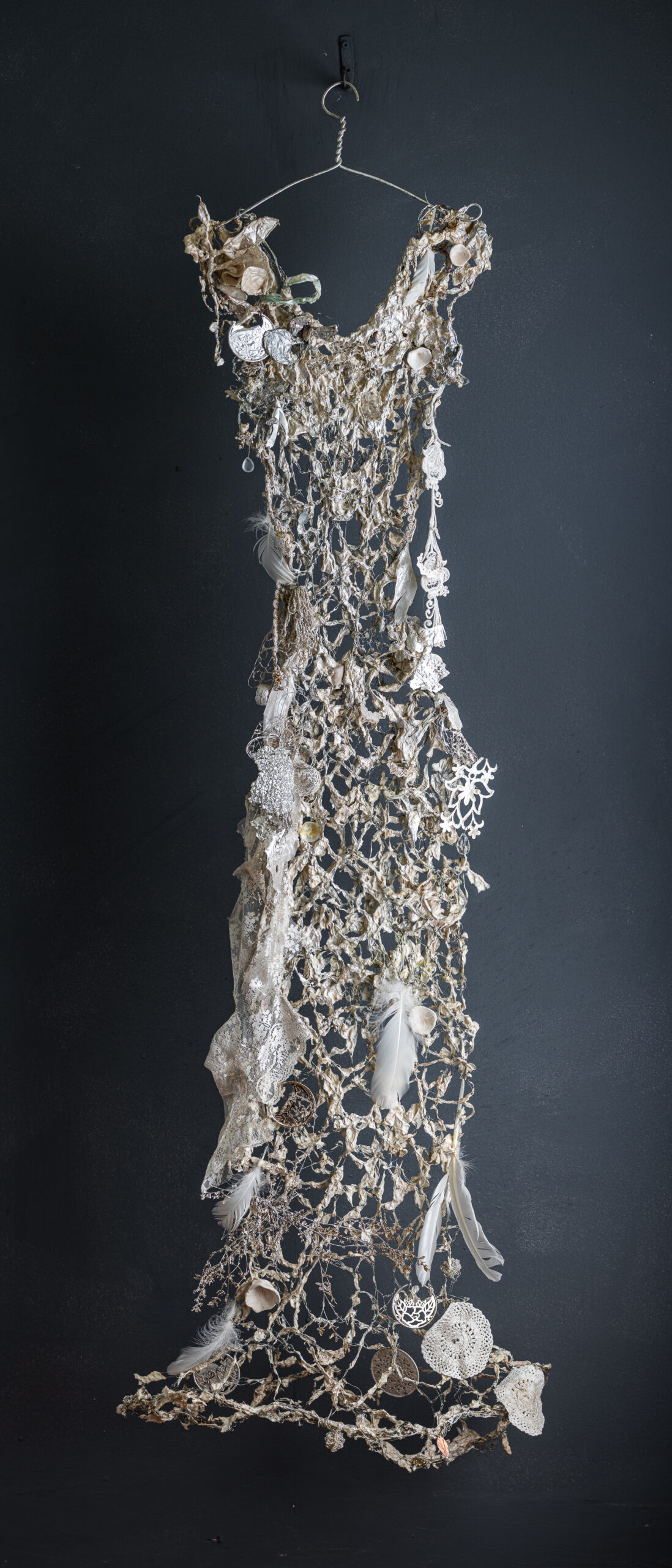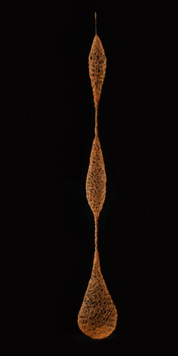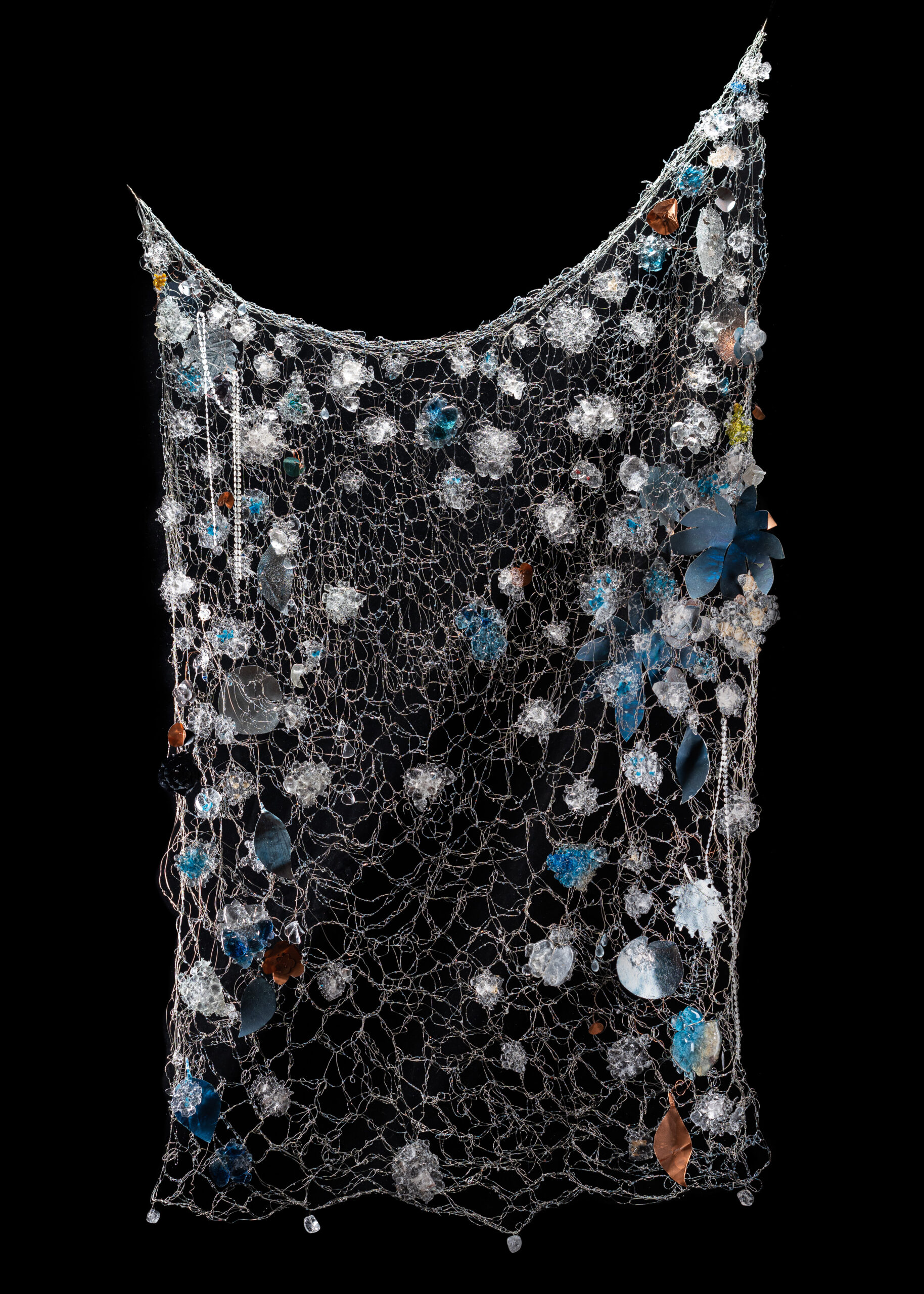 Susan Freda has received numerous awards, notably a residency & exhibition at the de Young Museum & a Pollock Krasner Award. Transparency, form, line and her deft use of material invoke intimate, emotive responses. Freda imbues her pieces with an ephemeral presence and ability to catch light. Created from hand woven wire and glass, her pieces envelope viewers in a seductive, entranced space. Their transparent and interconnected forms and jewel-like nature reference nature, fashion, and otherworldly phenomena. Freda’s work is inspired by numerous sources, some of which include: Giacometti’s stretched and elongated figures, Judi Pfaff’s installations and deft use of material; and the sculptures of Anish Kapoor. Her explores the transient, poetic, and ephemeral experiences of our world—intimacy & emotion, and offers a space for their consideration.