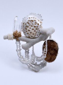 Tzu-Ju makes jewelry as a means of reconciliation between the internal and the external worlds. Her work explores the conceptual play of material and meaning. She is innately material curious and combines various statuses of material in layers like a palimpsest. This intermingling of everyday and precious material in the format of jewelry examines the meaning and perceived value of jewelry. The concepts of her work originate from an intimate place – objects that echo a sense of home against the backdrop of the world at large.