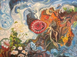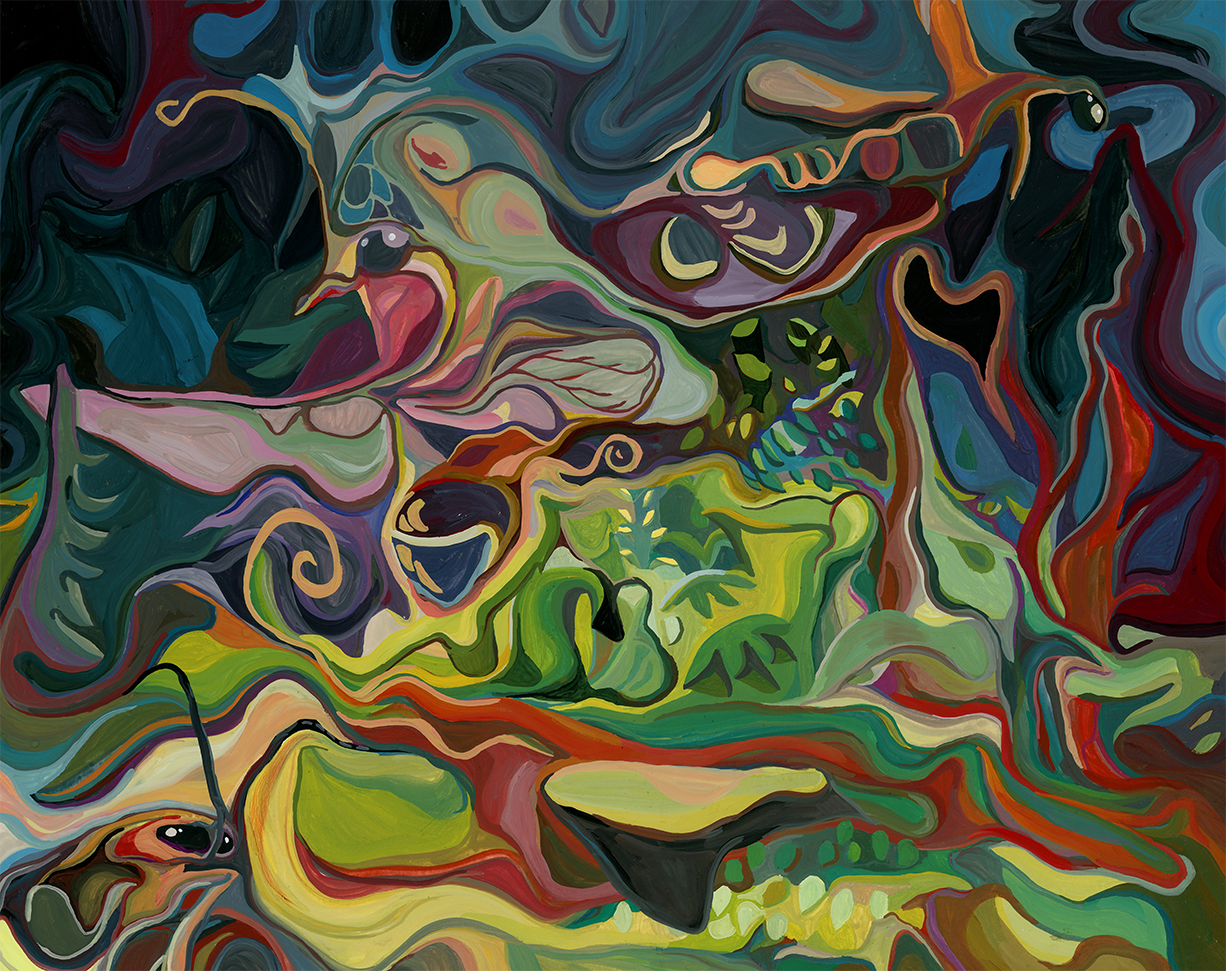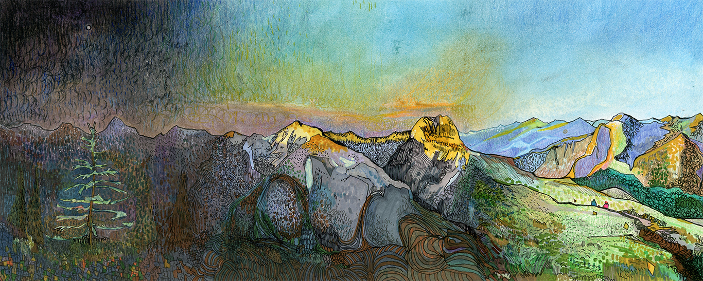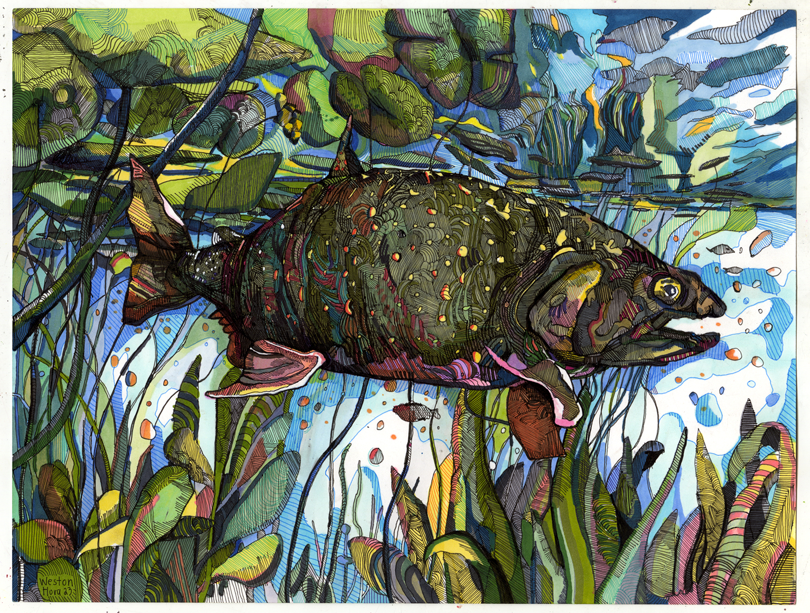 Weston Hora depicts expressions of wild nature in his paintings and drawings. Whether he is inspired by music, a mountain or his family, there is a wholeness in each piece that attempts to reflect the circular nature of the moment. Using gouache and inks, Weston follows a loose plan while he works, always open to new possibilities and subjects as they reveal themselves. He hopes that his work is an offering of calm in a strange world.